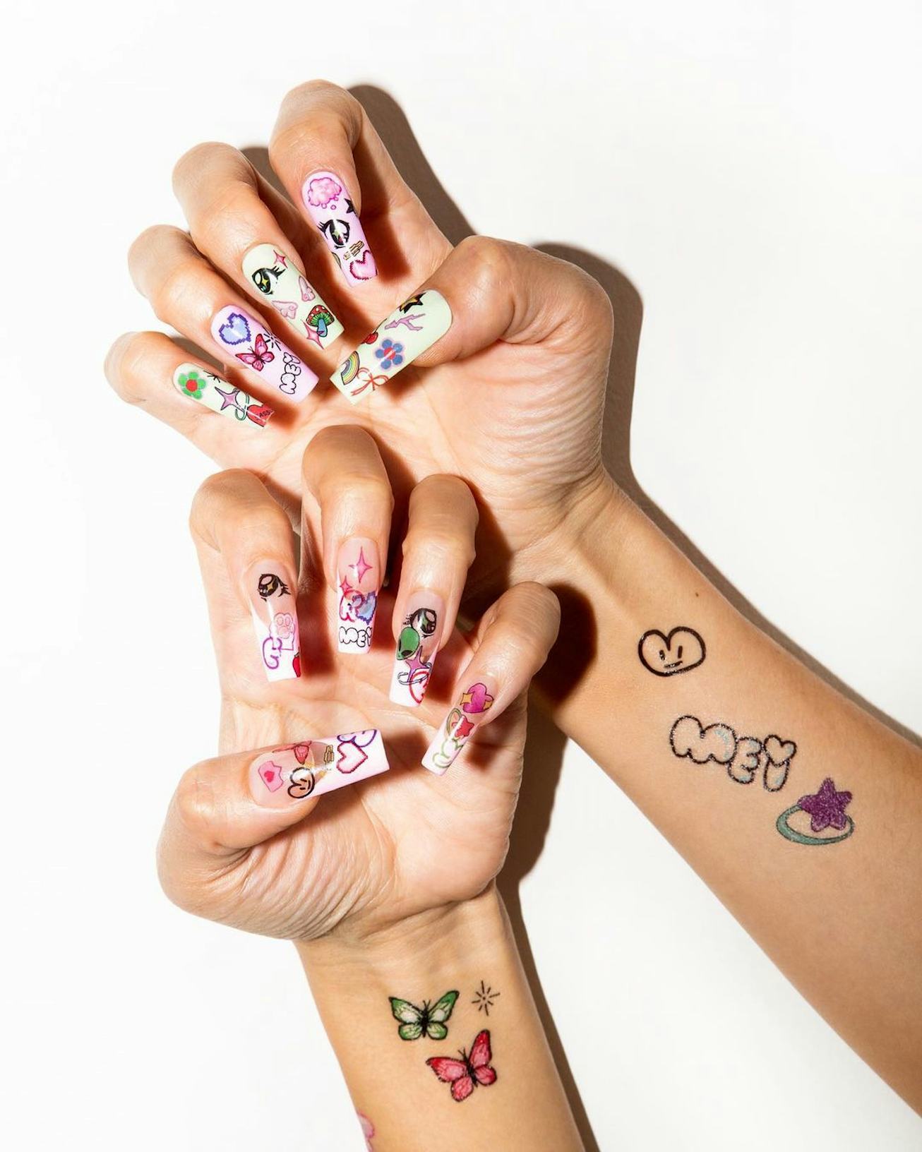 The collaboration is the ultimate combination of nail art, nostalgia, and tattoos that we didn’t know we needed. You can mix and match designs as you see fit on your nails and skin to give any manicure or outfit a healthy dose of 2000s kitsch. Every tattoo seems to be designed to make the wearer smile.