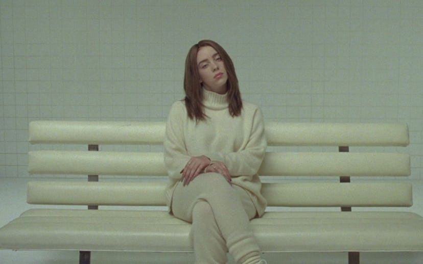 Billie Eilish has shed her neon-green roots — at least for now. In her new music video for "Xanny," the singer ditches the vibrant shade for an allover soft brunette shade that gives Eilish a totally new look altogether. What's more, the video marks Eilish's directorial debut, as she takes the reins on creating the visuals for the somber ballad off WHEN WE ALL FALL ASLEEP WHERE DO WE GO?In the video, Eilish also trades in her iconic baggy style for a monochrome ivory turtleneck and joggers, which match almost exactly to the padded bench she sits upon for the entirety of the visual.