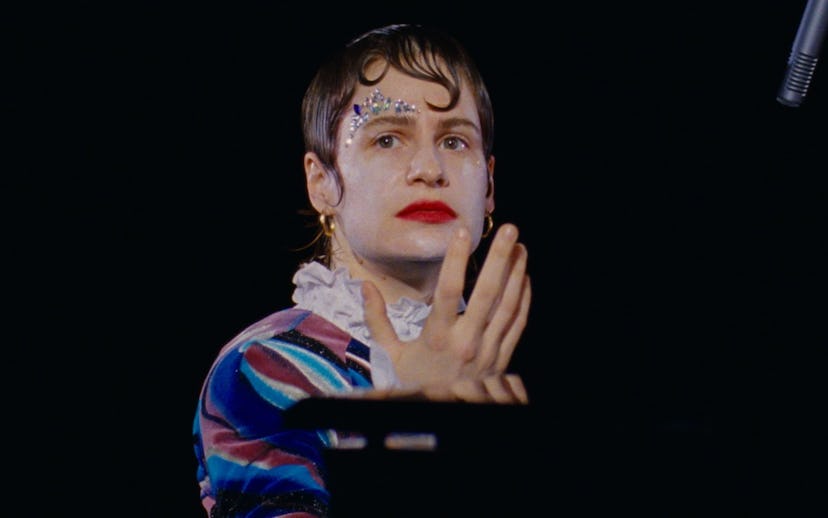 The film is a dreamy visualization of the emotions Christine puts into each songs -- from thrashing anger on the roof, to longing as she sits behind a piano alone on stage. In one scene featuring a group of dancers in a rehearsal space, joyful dancing turns into a run-in with a blood-hungry vampire. The bloody theme continues throughout the film, as Christine encounters several different characters and wipes blood from their faces, before ultimately becoming a vampire herself. Fellow pop star Caroline Polachek makes an appearance at the end for the title track, dressed in a black crop top with gloves and matching high-waisted shorts. They dance together under flashing lights for an iconic and horror-camp finale.