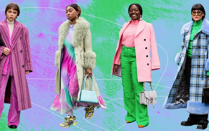 It turns out that typical black coats seem to be a fashion faux pas in Copenhagen, as a majority of showgoers made sure to keep their minds off the chilly temps by wearing all things bright, printed, vintage-inspired, or boasting interesting details. Take, for example, the retro-style coat with fur along the collar and cuffs, made famous by Danish brand Saks Potts. There were plenty of iterations of this popular piece, from a pistachio-green version to a pretty pastel blue. There were also loads of prints on everyone's outerwear, too, from patchwork and florals to snake print and plaid in all colors and sizes.