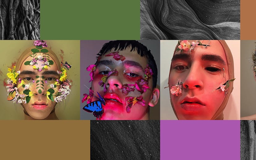 Whether or not you're already familiar with artist Cupid's otherworldly self-portraits, that incorporate everything from flowers and moss to bejeweled body jewelry, safety pins, and other hardware, you're bound to start seeing his work show up in places other than your Instagram feed. More than just creating makeup looks, he fuses together unconventional objects to create literal masterpieces.