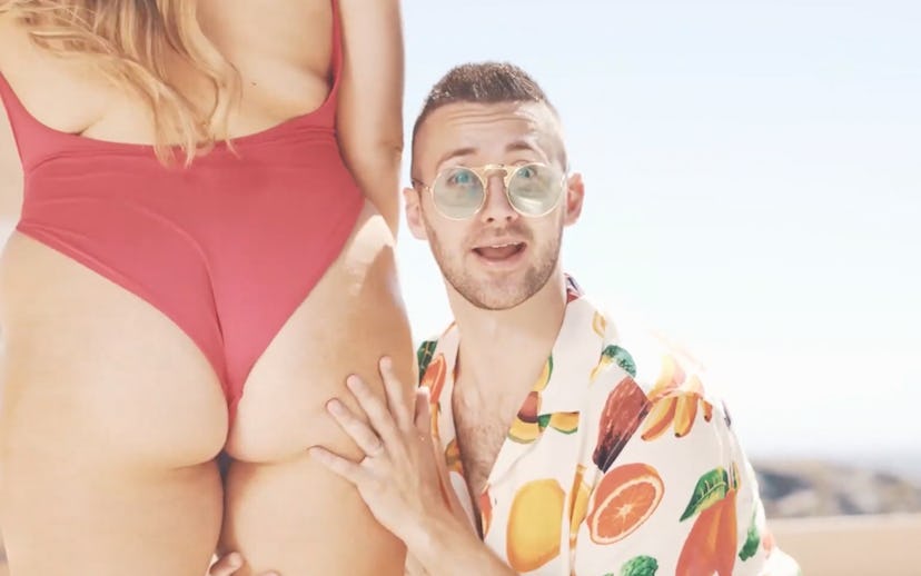 The video begins with a series of statements laid over some pool water: "Curves are the new high fashion," "Chubby is the new sexy," "We Out Here." Tripp posits that these queens deserve an anthem, which they do. What they do not deserve is this Cursed Song. As he lists all the names he knows to call them by (thick, thicc, and BBW), one model (who I really, really hope was paid well) squirts some lotion down her cleavage, and Tripp begins dancing.