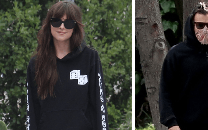 Dakota Johnson left her wonderfully decorated home for a little afternoon walk in Los Angeles, wearing what seems to be everyone's go-to quarantine fashion brand. The actress wore a cozy black hoodie with dice graphics by Free & Easy while out on Monday, the same brand worn by Harry Styles just a week earlier when he was out for his own socially distanced walk in the city. (He opted for the Free & Easy "Don't Trip" hoodie instead.)