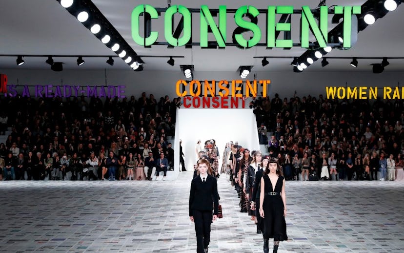 Since joining Dior as creative director in 2016, Maria Grazia Chiuri has presented her collections with an "easy-to-digest" feminist ethos, including those $860 "We Should All Be Feminists" T-shirts — worn by everyone from Rihanna to Natalie Portman — from her debut collection for the French fashion house. While many have praised the recent show over its timeliness of her recent collection in the wake of Harvey Weinstein's recent rape conviction, the sentiments surely weren't unanimous.