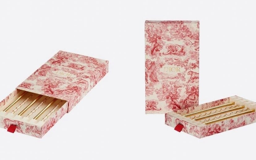 The straws are currently available on Dior's British e-commerce store and in boutiques for £120, which is approximately $150. The set does come with a total of six straws, making each cost approximately $25. Half of the straws are a solid gold color, while the other three feature a gold spiral motif. The vintage-looking packaging is designed to match many of Dior's other home items, including a $220 candle, $280 pillow, and $115 dinner plate.