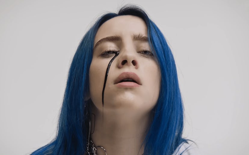 Billie Eilish's eyes bleed black in the music video for her song "when the party's over." It's hard to watch as the bleak substance sputters and gushes from her eyes. It's too vulnerable, gory, sad. Images of Eilish have littered magazines in the months since the release of her newest album, WHEN WE ALL FALL ASLEEP, WHERE DO WE GO?, and in almost all of them there's a restrained version of the eye-bleeding: Eilish gazes at the camera, completely disaffected, hooded lids drooping over her gray eyes. I call it "dull eyes."