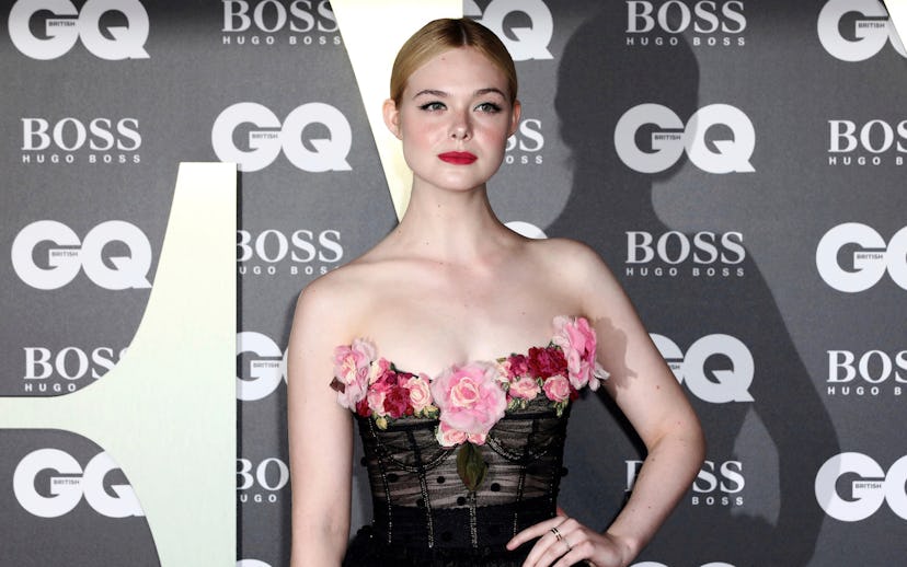 Fanning attended the GQ Men of the Year awards in London, where she dressed in a floor-length polka-dotted lace dress with a bustier detail by Dolce & Gabbana. Embroidered on the skirt were dozens of pink flowers, and a bouquet hugged the top of the bustier.