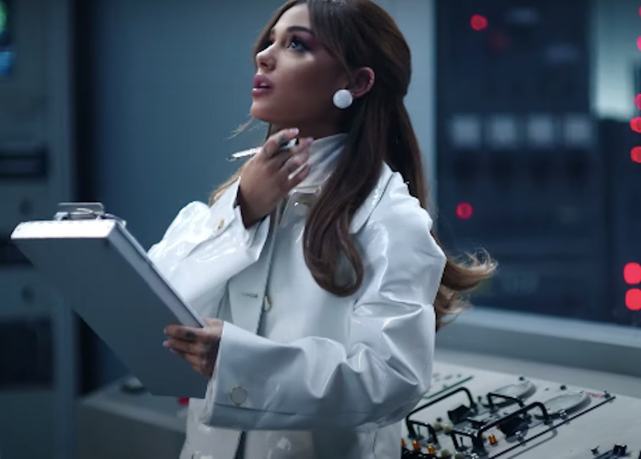 But don't go thinking the former Nickelodeon star was going to give you, well, you know. Just as she did in the accompanying visual for "positions" (another song peppered with sexual innuendos), Grande takes the math pun in the title more literally for the video, casting herself as a scientist who runs around checking estimates on her clipboard, adjusting knobs on a high-tech dashboard, and consulting her similarly-dressed coworkers as she tries to make an alternate, robot version of herself come alive on the operating table. (Of course, this is Ariana Grande we're talking about, so naturally, this scientist walks around the lab in sky-high white vinyl boots with a matching ankle-length coat.)