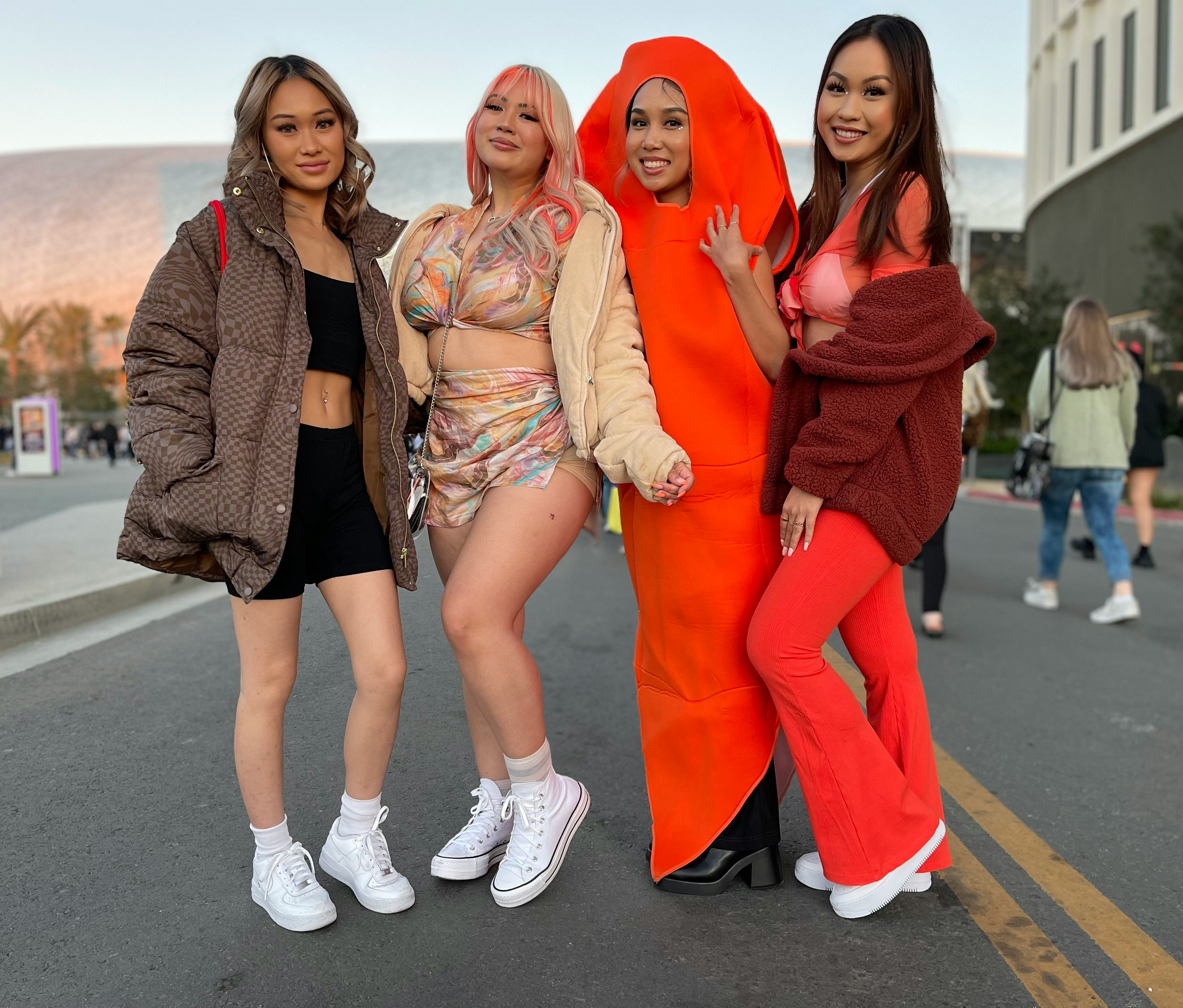 (Left to right) Vy Nguyen, 23, Orange County, California: “I’m excited to see Jimin in person. I want him to sweat on me and possibly spit. I’m trying to get close, close. I love the way that he moves, his body language. He is the best dancer.” Naomi Tran, 23, Orange County, California: “It’s my birthday and it was what I’d been dreaming of. Last year, Vy gave me a birthday present and it was a check for our future BTS concert and, a year later, we’re here. When I heard the concert date announced, I said, “There’s no way! It was meant to be.” Jackie Nguyen, 23, Orange County, California: “I’m dressed like a carrot because Jungkook was dressed as a carrot for the 4th Muster concert and it’s orange like Permission To Dance. I am excited to see Jungkook and confirm that he’s real. I love that BTS love their fans and seem really genuine.” Phoebe Nguyen, 23, Orange County, California: “I love their music and they have such a positive energy about them and they really care about their fanbase, which is really reassuring as a fan. It’s connected me with a lot of people in my life. I’m just very excited to see them.”Pamela Chelin