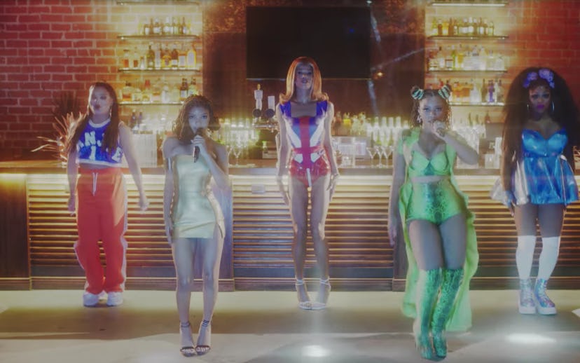 The Bailey sisters teamed up with drag queens Naomi Smalls, Mayhem, and Vanessa Vanjie to complete the performance — Halle as Posh Spice, Chloe as Scary Spice, Smalls as Ginger Spice, Mayhem as Baby Spice, and Vanjie as Sporty Spice. They took over luxe and glittering interiors over at NYC's The Chapel At The Abby, an iconic gay institution, for the performance.