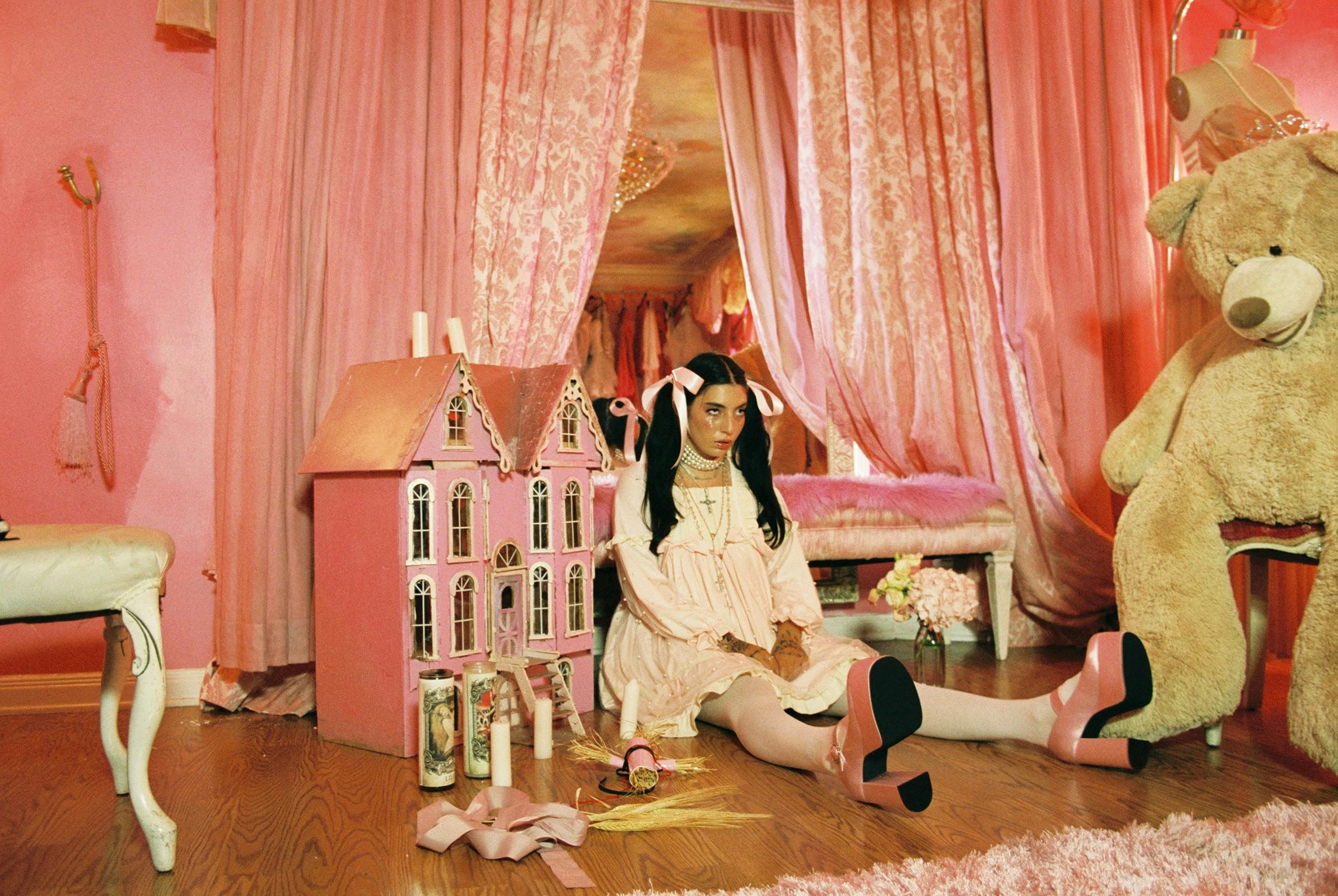 Here, NYLON premieres the song's video, a quarantine-filmed visual that includes a Mean Girls-esque burn book, and the singer dressed to the nines in Harajuku fashion. Lounging in the maximalist pink interiors of her room, the young artist fantasizes about wanting to be tied down again, even if it ends up kind of toxic: "Something in the way you hurt me/ I love it though it's quite unnerving."
