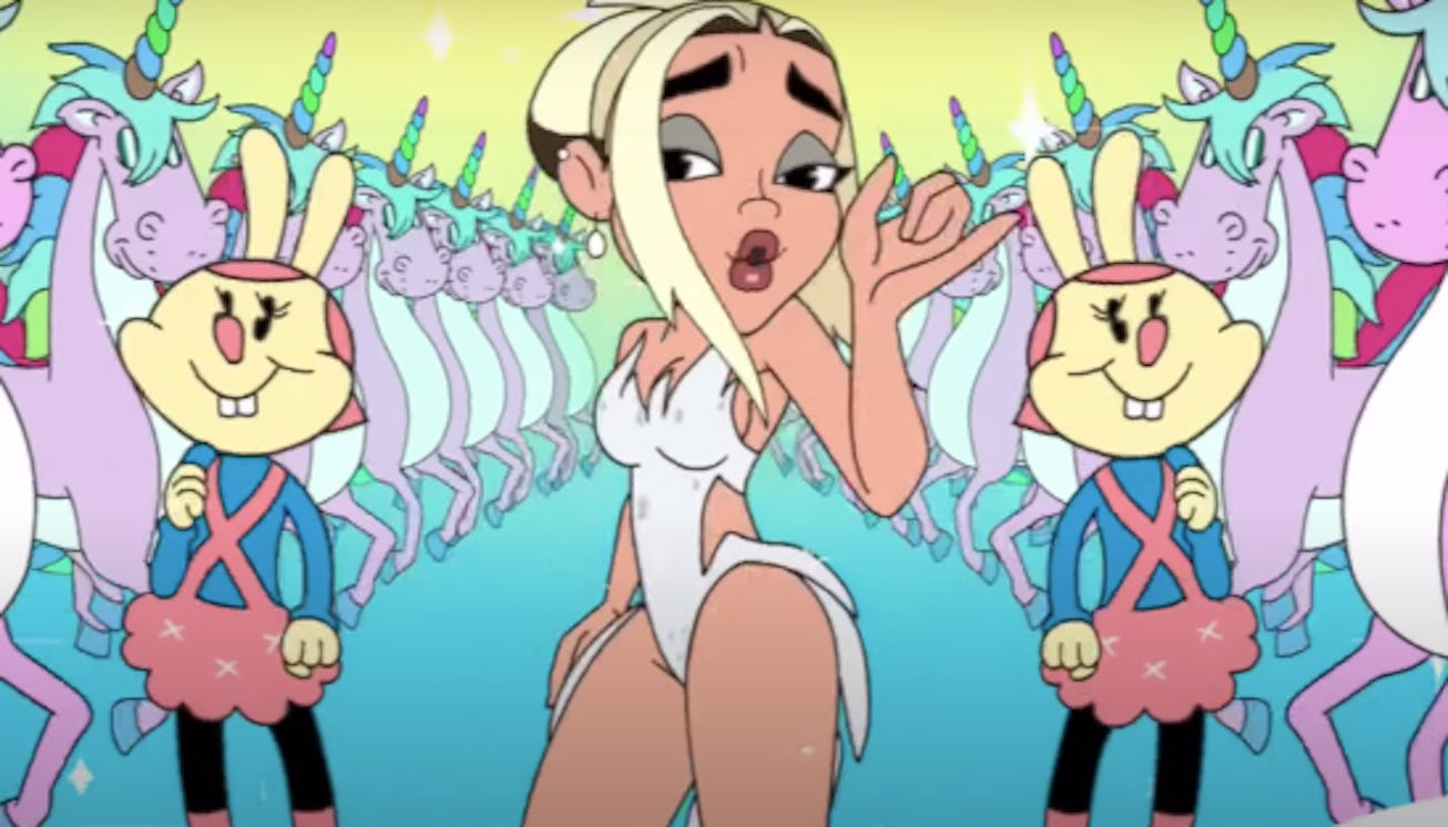 For "Hallucinate," the latest single off the record, Dua has done just that, bringing us along with her on a strange dancefloor trip inside of her mind, in an animated clip directed the Mill’s Lisha Tan. A Betty Boop-style Dua saunters along a dancefloor that morphs into a hallucination, as the song title suggests, filled with psychedelic hallmarks like unicorns, dancing veggies, and a brief foray into a bad trip that's quickly squashed.
