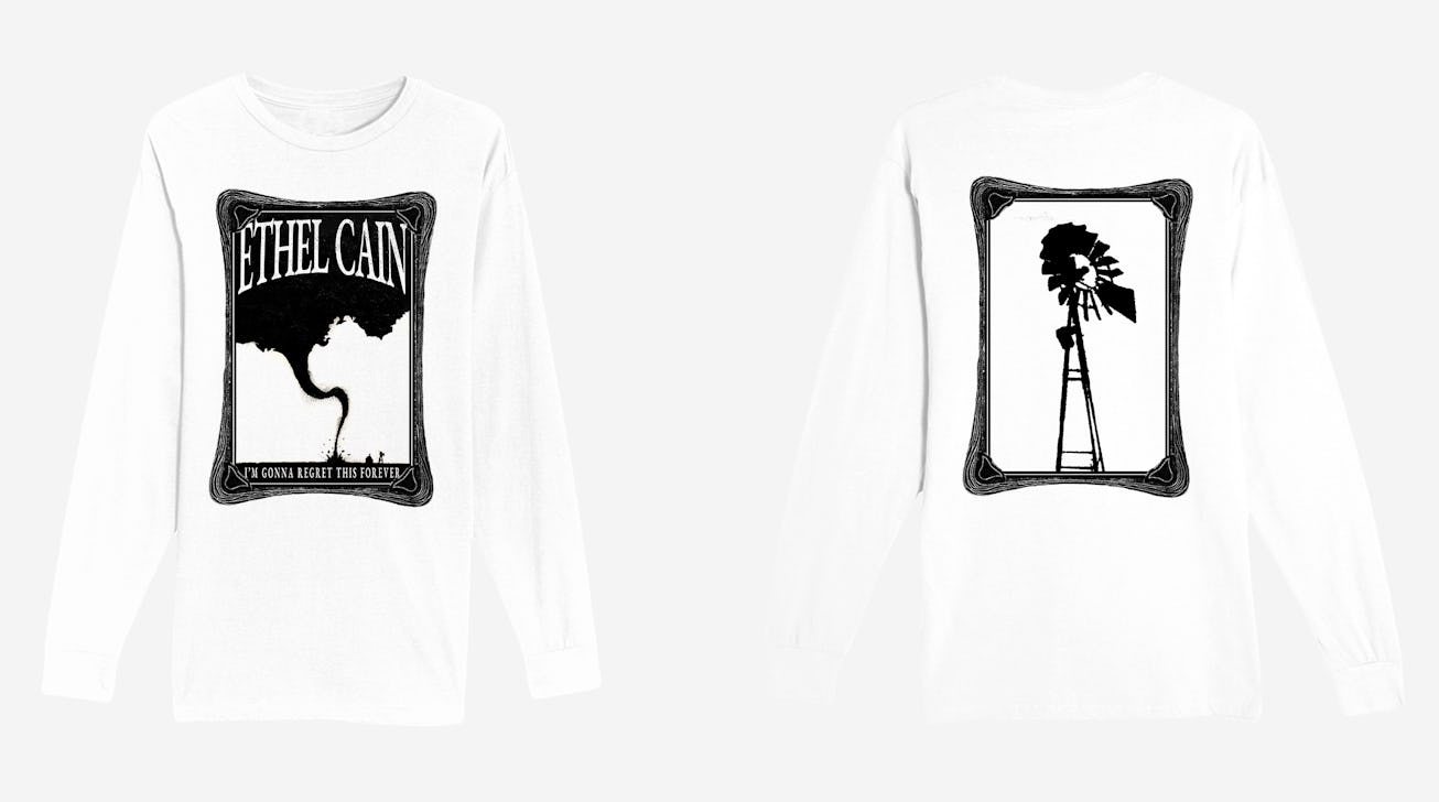 Many of the items will be printed with new designs specific to Coachella; in the case of Cain, the merch will feature new illustrations done by the artist. Cain’s exclusive long-sleeve t-shirt is printed with drawings of a tornado and a windmill on the front and back, along with the text “I’m gonna regret this forever.”