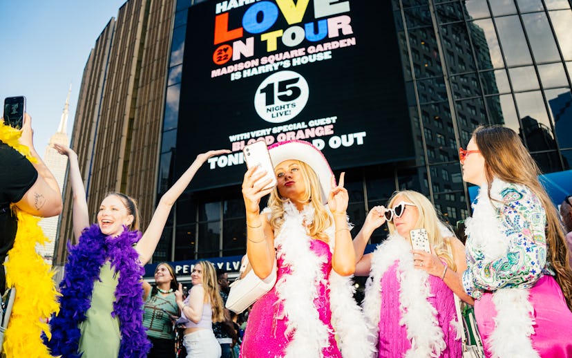 To celebrate the occasion, Styles’ most dedicated die-hards looked to him as a muse for their outfits for the evening. As is tradition among the artist’s shows, many fans DIY-ed looks that emulated those Styles has worn in the past (think crocheted knits a la JW Anderson), that were inspired by his music (sparkly fruit patches in homage to his songs “Cherry” and “Watermelon Sugar”), or generally evoked the vintage, ‘70s-era glam rock vibe that Styles has made his signature. Among the most popular accessories were, of course, boas — a nod to Styles’ Gucci look from the 2021 Grammy Awards — of which there were so many that it’s likely Madison Square Garden, Penn Station, and the two-block radius surrounding both will be covered in feathers through late September.