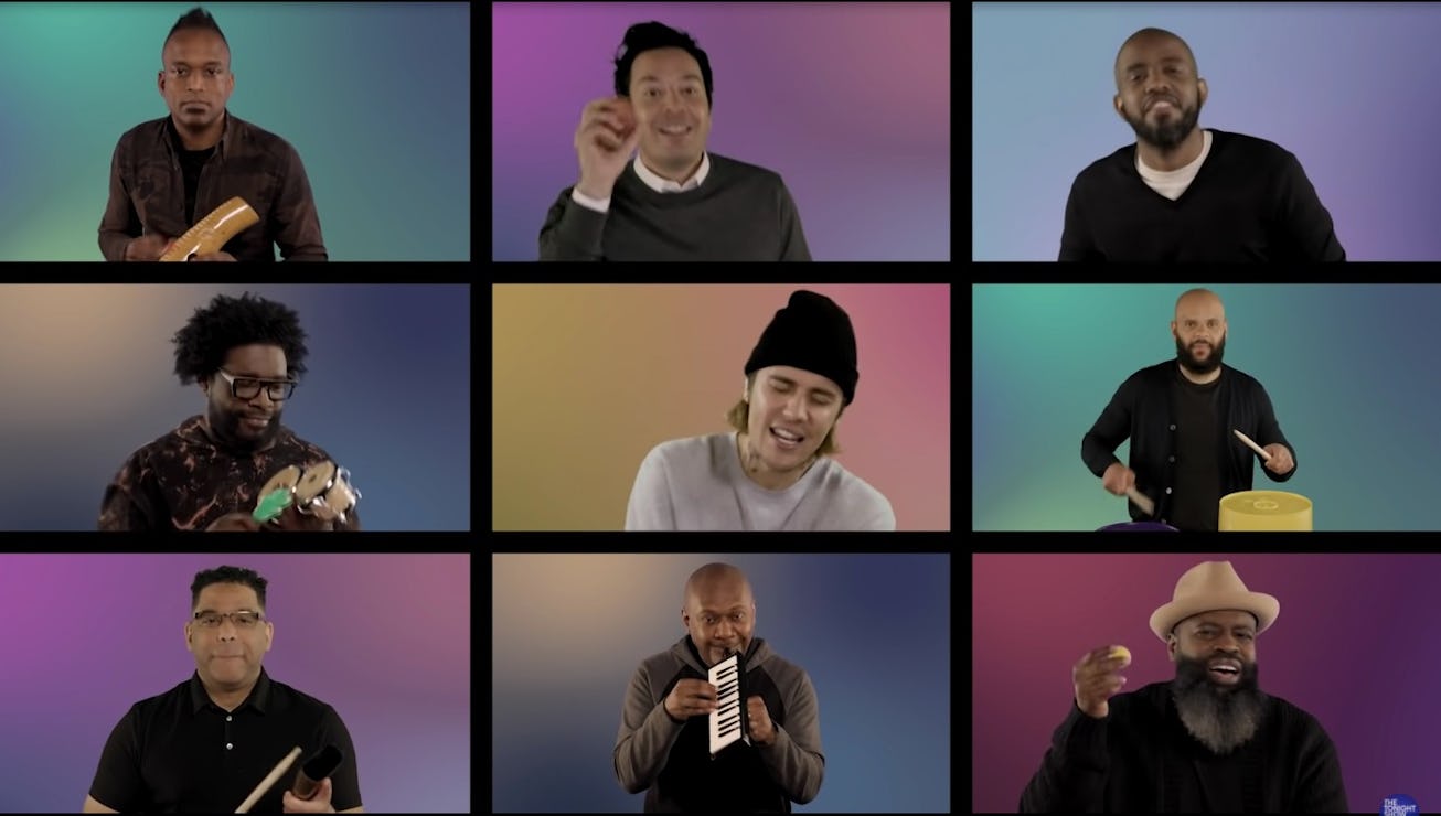 As is customary with the bit, everyone involved played some version of a kiddie instrument while arranged in Brady Bunch fashion (with Bieber plinking along on a red toy piano) — but the best part is watching Bieber singing and swaying along while not once opening his eyes throughout the entire two minutes. Yes, the vibes are that strong with this one.