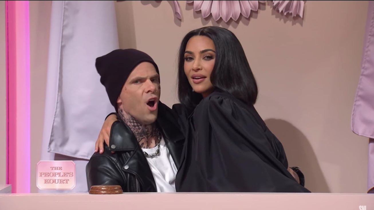 But the funniest digs came in “The People’s Kourt” sketch, where Kim cosplayed as her sister Kourtney. Midway through, Mikey Day shows up as Kourtney’s very public boyfriend Travis Barker, and the pair get into some oddly specific kink play, which may or may not include an act involving Barker and a pair of sticks drumming “All The Small Things” on Kourtney’s ass. And with resident Timothée impersonator Chloe Fineman joining in as Megan Fox and Pete Davidson taking on Machine Gun Kelly, Kim got a lot of mileage out of jokes about the suddenly inseparable punk-rock quartet. “Wait. Why are we best friends,” Fineman, as Fox, asks at one point. “Because our boyfriends have tattoos for necks!” responds Kim, as Kourtney.