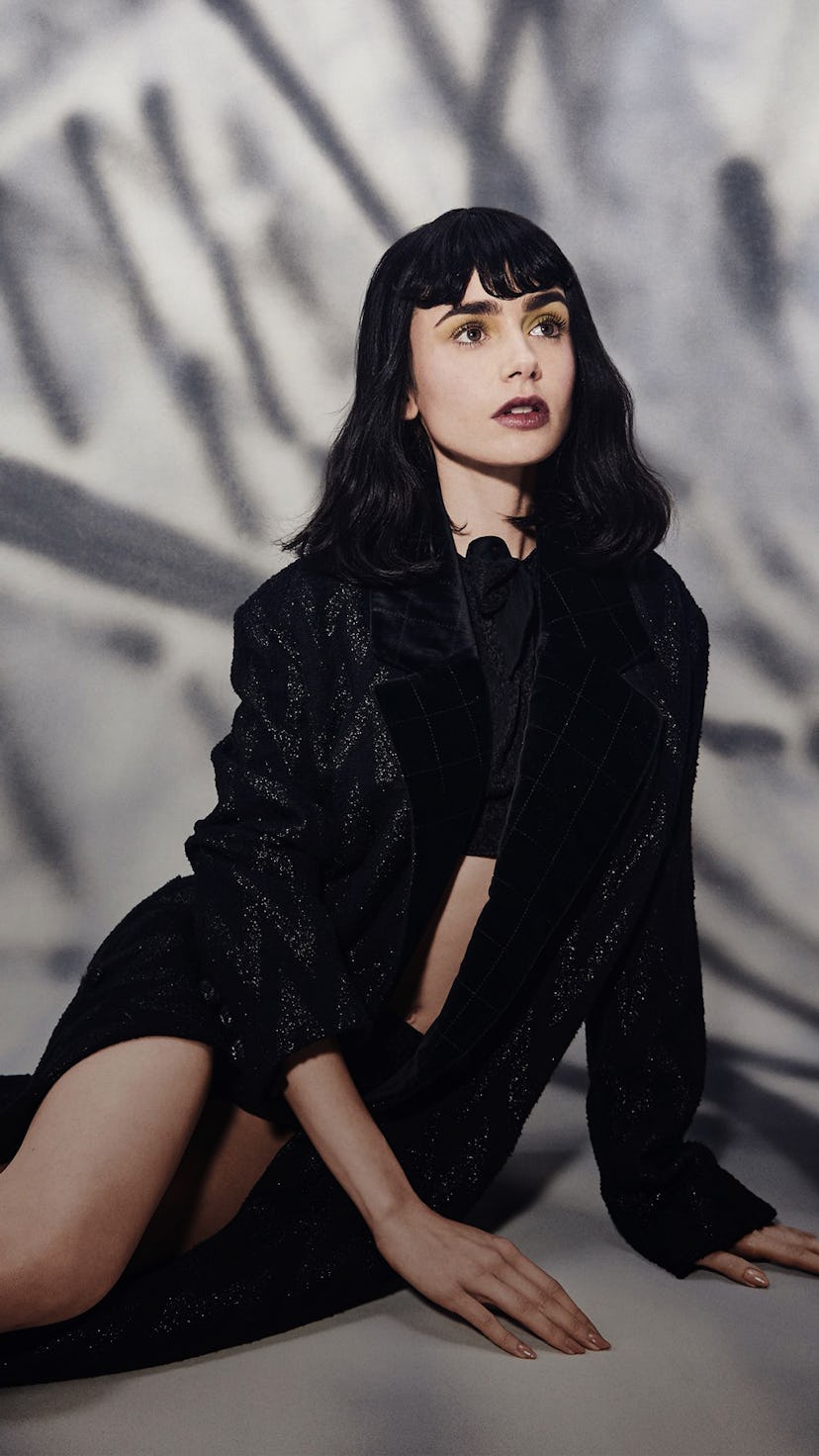 Collins has experience occupying two different worlds simultaneously, and not just because she’s an actor. She’s been doing it in life since she was 5, when she left her native England behind for the States following her parents’ divorce. Her father is famed musician Phil Collins, making the Lily certified Hollywood royalty, so much so that she was presented as a débutante at Paris’ le Bal, a common coming out celebration for celebrity spawn. However, as her Instagram reveals, Collins is as comfortable deep in the mountains as she is in her adopted city of Beverly Hills. She Zooms in a simple, light blue Oxford shirt, but when our conversation turns to the Hitchcockian supernova she embodies for the photos accompanying this story, she exclaims, “I loved the whole thing: the wig, the vibe, the clothes.” Her career, too, belies what one might call a comfort with range: After cutting her teeth on projects as dark as they come (To the Bone; Extremely Wicked, Shockingly Evil and Vile; Okja), she’s now playing the latest addition to the Hollywood canon of basic bitches.