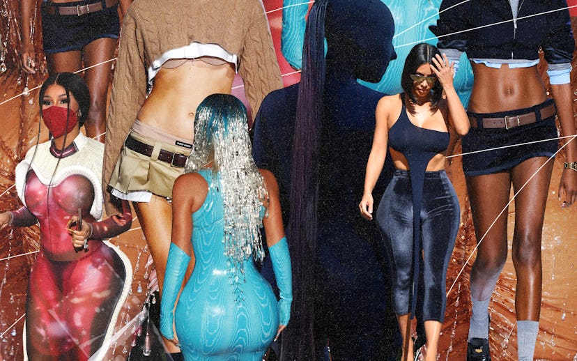 The want for answers is inevitable when the return of low-rise provokes an emotional response in those who lived through the early aughts heyday of normalized eating disorders and a pop culture that chastised women for their appearance. It was in 2008, as Paris Hilton’s fame was beginning to decline and Kim’s rose, that Hilton called into a radio show to say that Kim’s butt was “disgusting,” and that she “wouldn’t want it,” likening Kim’s body to “cottage cheese stuffed in a trash bag.” (Hilton apologized for the remark less than 24 hours later.)