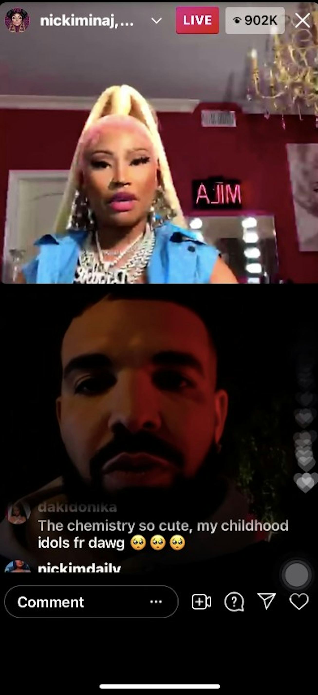 Speaking of the Champagne Papi, Drake joined Nicki for the last five minutes of her IG live. He called in from a random street and congratulated her on the re-release and urged her to return to music. “I love you with all my heart and I’m glad that you got in your bag for this re-release, but you know what time it is now,” he said.