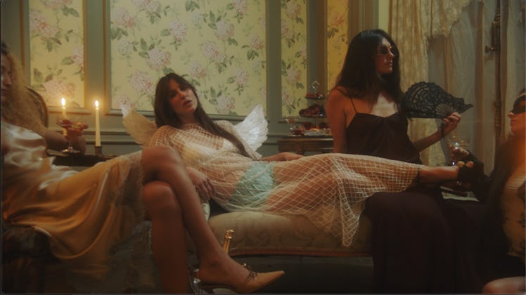 Whenever I write and finish a song that I love so much, I start immediately seeing the visuals in my head. I was with Thomas [Doherty], and he had asked to be in the video. He was like, “What’s the concept for the video?” And I hadn’t even thought about it. I closed my eyes and I just got this image of us at a party, and it’s like this wild Hollywood, Babylon, Saltburn party. I’m dancing in a crowd of people, and he looks at me and then looks back, and the room is empty, and it’s just me. It’s this idea of when you see someone across a room and you’re so struck by them and their presence and aura and everything, and it came from there.