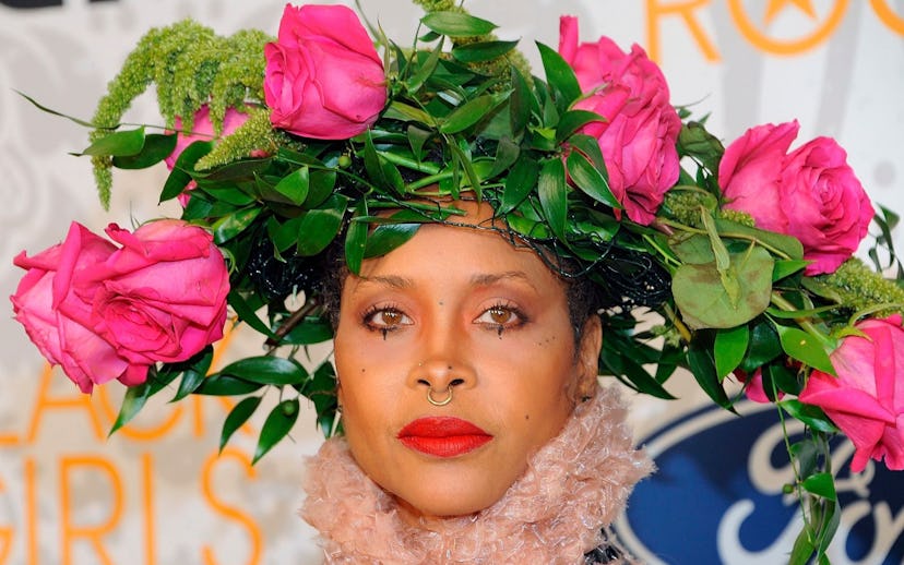 In addition to creating generation-impacting music, Erykah Badu is also known for debuting avant-garde beauty looks, like an "infinity stone" grill that set Twitter ablaze. It's no surprise, then, that her look for Black Girls Rock! awards show last night was over-the-top and out-there. The singer-songwriter rocked a nest of fresh, hot pink roses on her head, and it was a futuristic take on the flower crown trend. Badu paired the roses with fresh, minimal makeup, save for a red lip and artfully placed eyeliner.