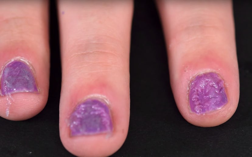 She also tested the remover on a human subject, her boyfriend and frequent guest star, Ben, using various combinations of nail products. The winning formula was gel polish with no top coat or base coat, which did produce the "exploding" results. Luckily, there was no adverse reaction, but that doesn't mean it's safe, either.