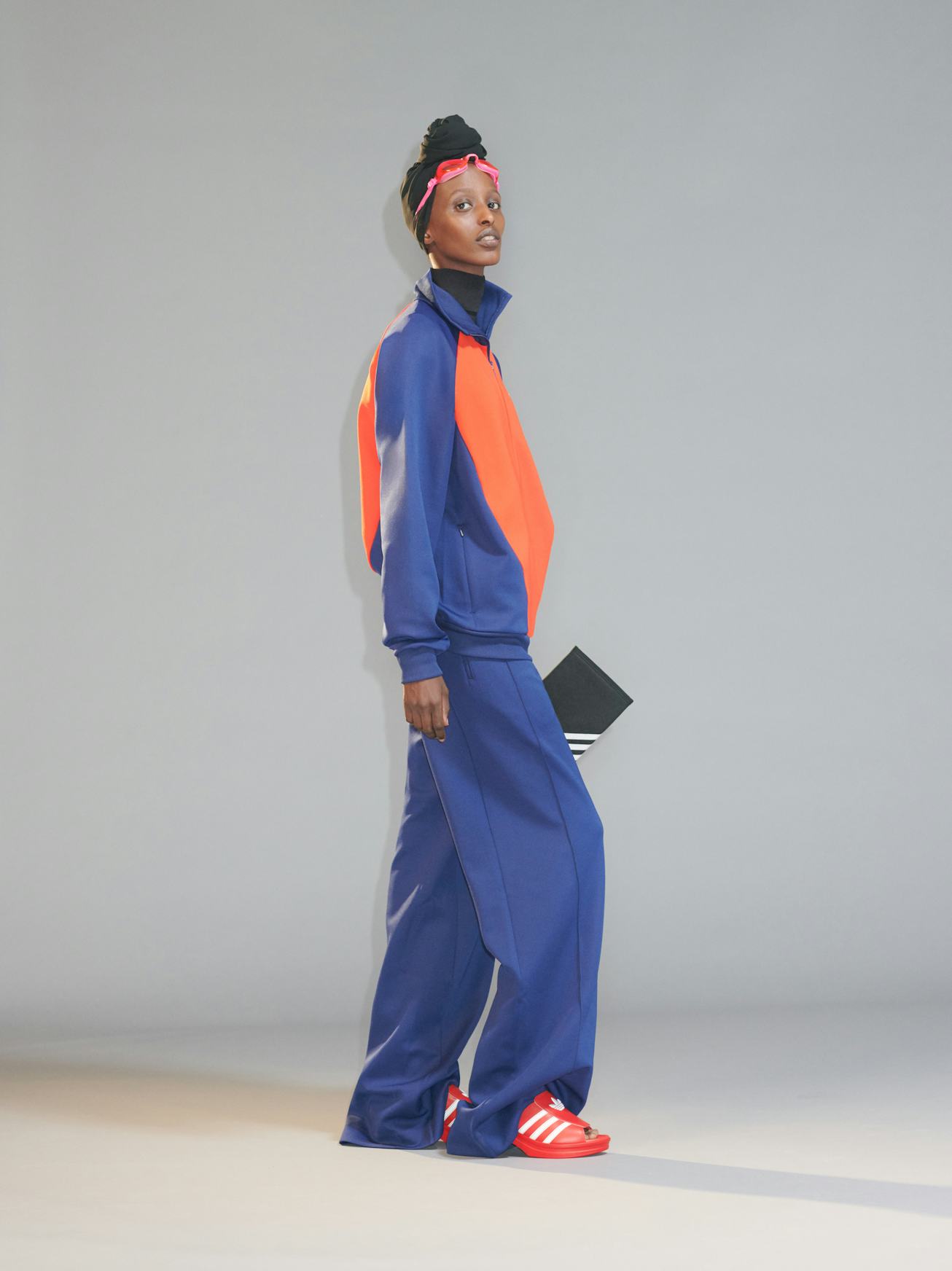 Volkova turned to Adidas' archives for inspiration, using some of its earliest designs from the '70s while adding her own signature aesthetic — a mix of knockoff culture and Y2K fashion — to each piece. One standout item is the heeled Trefoil Mule, which Volkova reimagined from the brand's popular Adilette slides, along with a bright pastel pink bowling bag that's actually meant for table tennis, with its outside zip pocket shaped like a paddle. Tracksuits are baggy with a slouchy fit, thigh-high leg warmers are adorned with Adidas' iconic three stripes, and jersey-style tops are updated with a colorful floral print and one-shouldered, asymmetrical silhouette.
