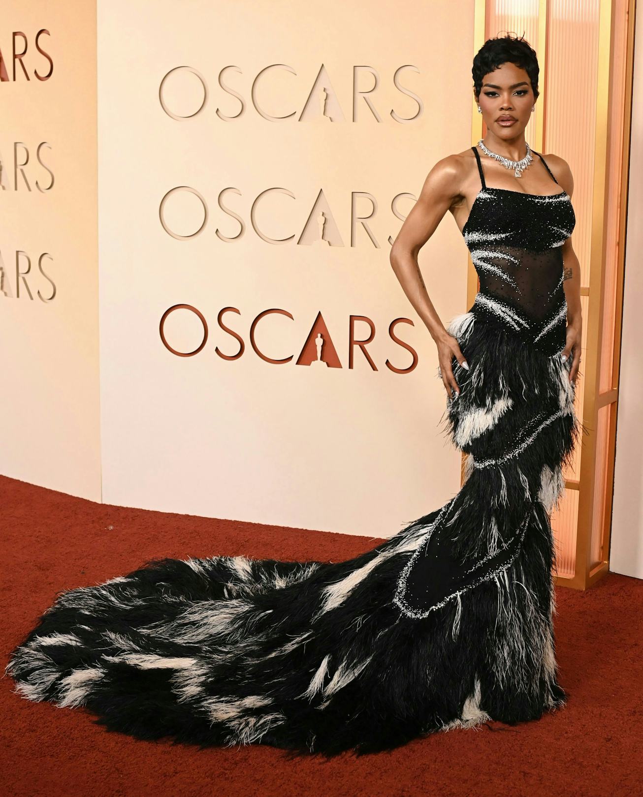 While Taylor didn’t take home the Oscar tonight, she is a shoo-in for best dressed this awards season. After seeing her front-row at the Chanel show a week ago — and seeing her wear a still-warm-from-the-model fur coat at the Chanel pre-Oscar dinner yesterday — we knew she’d be wearing a Matthieu Blazy’s design. This zebra-meets-palm-tree-meets-fringe dress is dynamic, sleek, and still packs the punch of a traditional train without relying on tulle or excessive glitter.