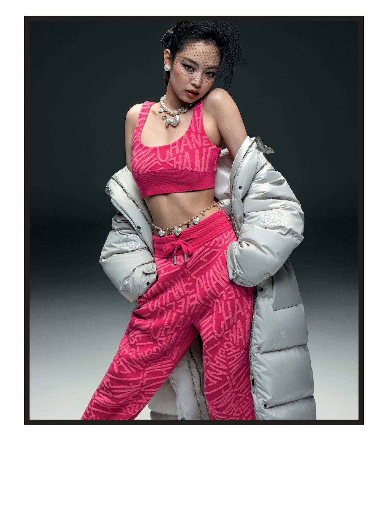 Lensed by Dutch duo Inez & Vinoodh, the first photo released on Thursday, Sept. 23, so far reveals Jennie wearing the French fashion house’s hot pink and embroidered bralette-and-sweatpants set, along with a silver puffer coat hanging just below her shoulders. She’s also seen in a matching “CC” charm belt and necklace, finishing her look with classic heart-shaped Chanel earrings and a netted veil.