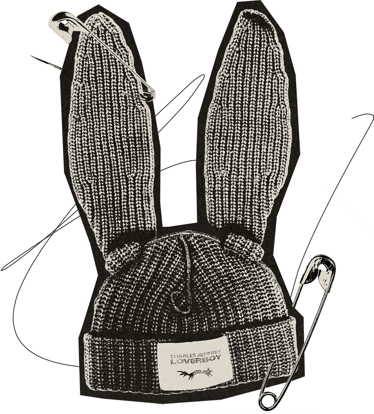 From dozens of K-pop idols, like TWICE’s Chaeyoung and Stray Kids’ Seungmin who both donned the animal ear-style beanies from the London fashion label Charles Jeffrey LOVERBOY, to models on the runway, everyone is embracing the bunny hat, which has experienced a surge in visibility. The trend has swiftly trickled down through social media, with crafty Gen-Zers sharing knitted bunny hat creations on TikTok, uploading tutorials on YouTube, and selling bootlegs on Etsy and Grailed. Clearly, the outlandish ears of this small furry mammal have enamored consumers across global and cultural borders and been remixed by designers and DIYers alike into new versions that range from edgy to sleek or ultra-cute. But how did the bunny hat get this big, and why does everyone want it on their heads?