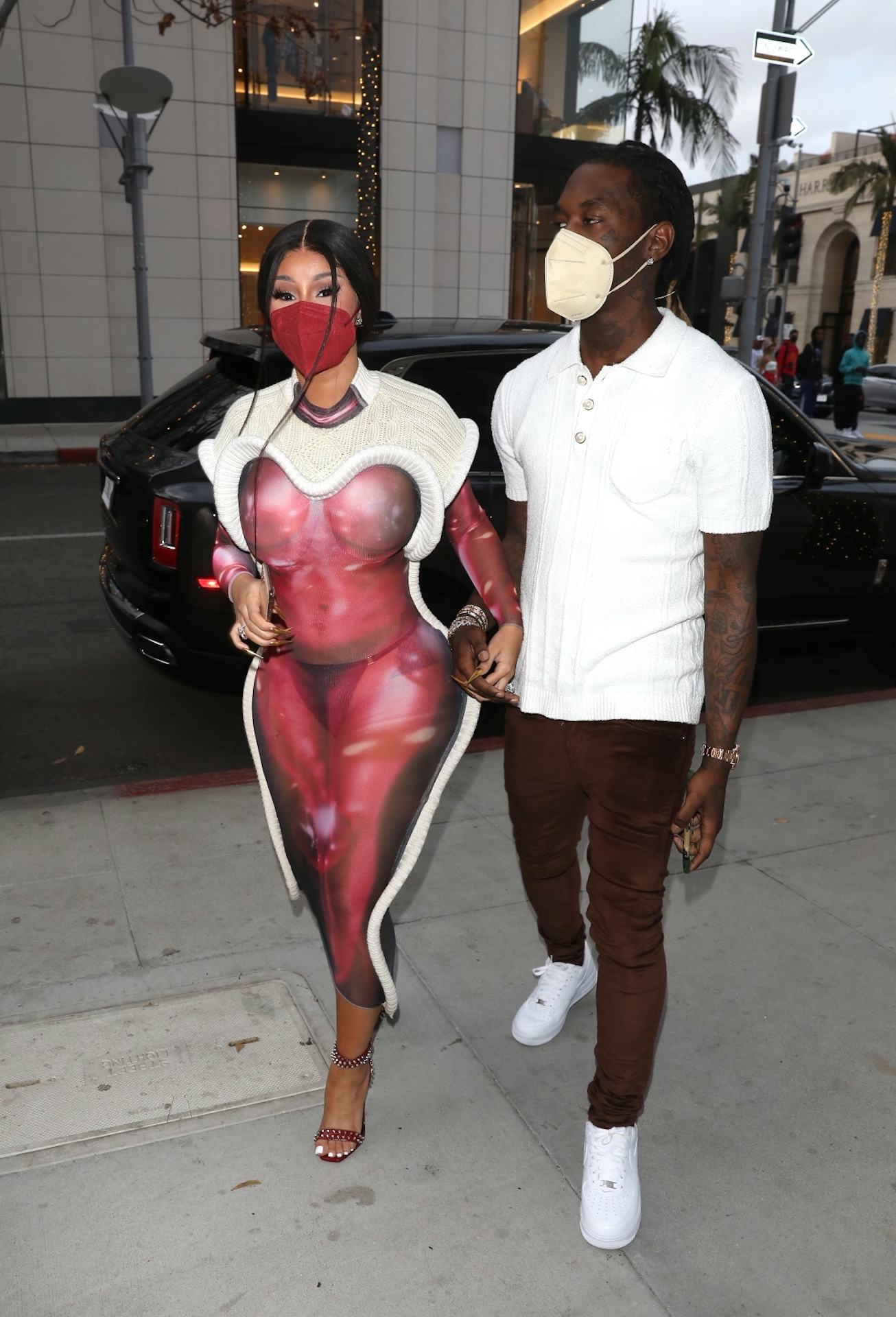 When you're Cardi B, shopping is a full event and be dressed for as such. The rapper stepped out with Offset in Los Angeles over the weekend wearing a red 3D dress by Pierre-Louis Auvray with a matching face mask and studded heels.