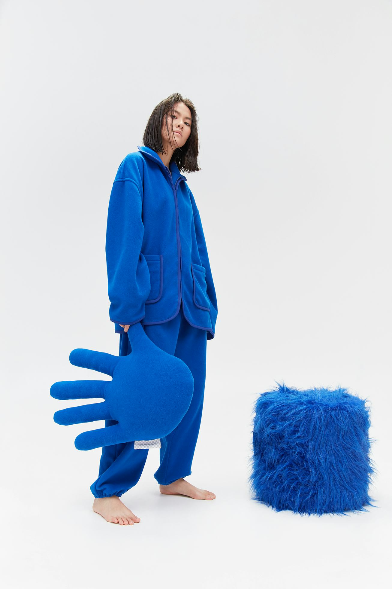The debut collection includes head-turning pieces like small stools and candles (for baths, suggested Nuriev), glassware and velour dining chairs for future dinner parties, terry cloth notebooks, and a sock-shaped rug. "It really is created to cater to people’s needs and desires around their homes," added Nuriev. "I know if I'm going to watch a movie I will definitely need the Crosby Friend human size pillow, blue fur blanket, and an ottoman."