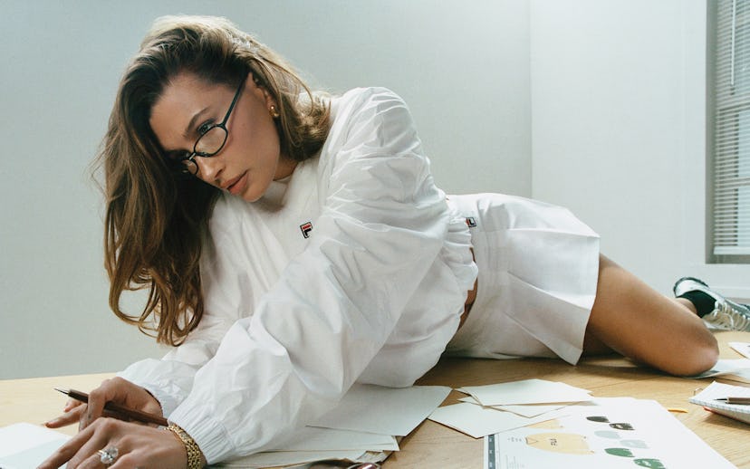 Hailey’s a known Pilates lover, so this comfy collection made in collaboration with FILA comprised of sweatsuits, sports bra, and windbreakers feels right. Go for the color du jour, butter yellow, or the gray for a classic gym-rat moment.