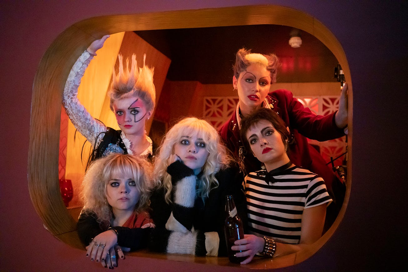 Throughout the series, FX’s Pistol features a number of icons who served as the faces of the punk movement: Jordan (Maisie Williams) challenges the ruling class with scandalous looks often consisting of clear fetish raincoats and bold rubber underwear; Nancy Spungen (Emma Appleton), whose turbulent relationship with Sex Pistols bassist Sid Vicious (Louis Partridge) shows the darkest sides of the era; and fierce singer-songwriter and founding member of The Pretenders, Chrissie Hynde (Sydney Chandler), who is determined to succeed.