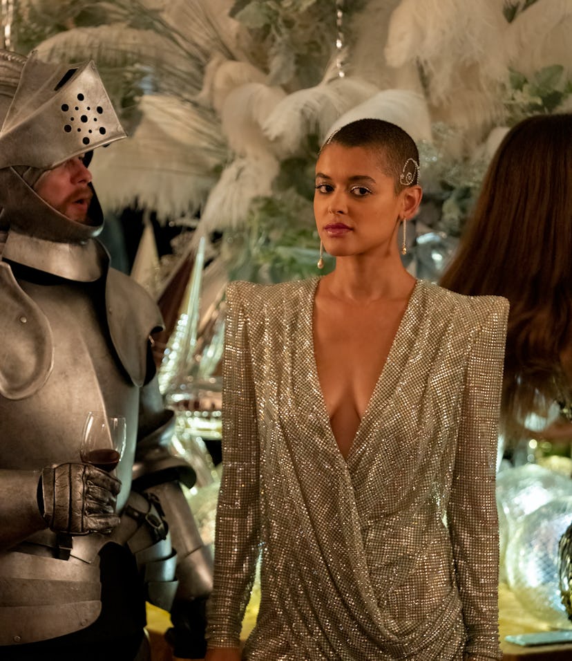 In the debut season’s final scene, Julien wore a Raisa & Vanessa sequin dress with accentuated shoulders, along with pearl drop earrings and bejeweled designs on her shaved head.