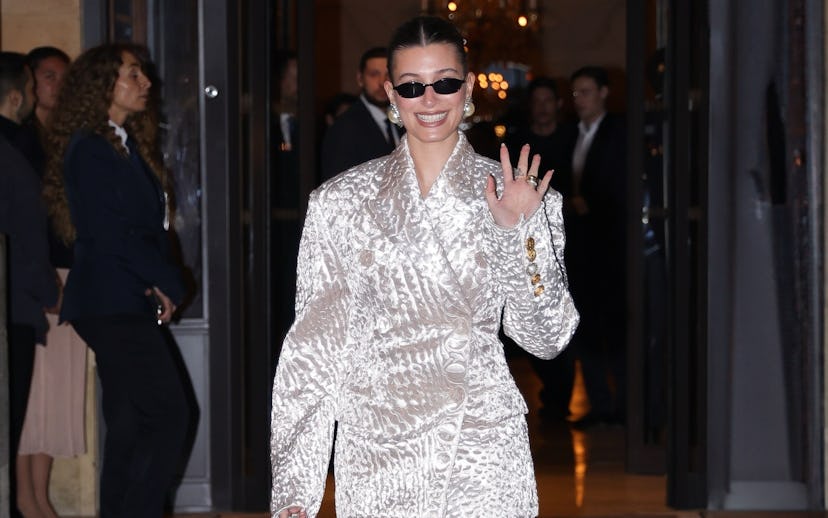 Mrs. Bieber is known for a fresh-off-the-runway moment. We’re still thinking about the Saint Laurent suit she wore last October, but for those looking to still show a little skin, she wore this velvety Schiaparelli that fulfills her suiting obsession. In fact, she’s such an advocate for suiting, Wardrobe.NYC enlisted her for a collab full of sharp double-breasted blazers, her go-to shape.