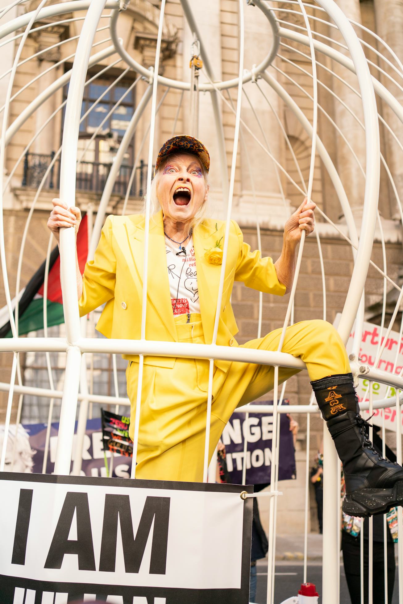 Vivienne Westwood is going back to her punk roots. The 79-year-old designer attended a protest against Julian Assange's extradition to the United States while hanging 10 feet above the ground in a giant birdcage.