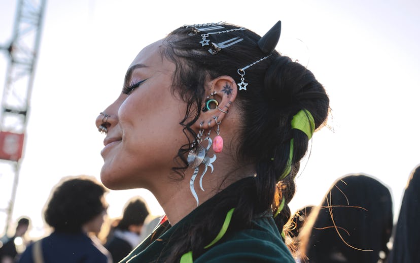 As I learned while testing out my own set of Loop x Coachella Experience 2s for the weekend, the new-gen earplugs are very much not an eyesore; they just look like you have quasi double daith piercings. My real daith piercing, however, prevented the outer ring of my left Loop from laying completely flat, but that didn’t seem to impact the noise-dampening qualities (though the fit is a different story if I have jewelry in my conch). The slim connector cord magnetically closes around your neck to vaguely resemble a bolo tie (on-theme) and didn’t clash too terribly with any of my shoddily prepared outfits.