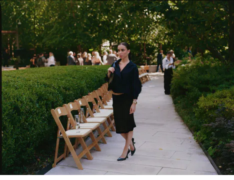 When it came to styling her show outfit, Maddie wanted to strike a balance of chic, cool, elevated, and comfortable. The brand provided a navy cropped button-up, which she paired with a sheer midi skirt and black heels — the only pair she’d managed to wear all week without blisters. Accessories elevated the ensemble: her bag discovered in Mexico City, silver statement earrings, a tennis bracelet, and her everyday watch. She described aligning her look with the overall vibe of the designer’s collection as “fun and creative,” a way of pushing herself beyond her usual personal style.
