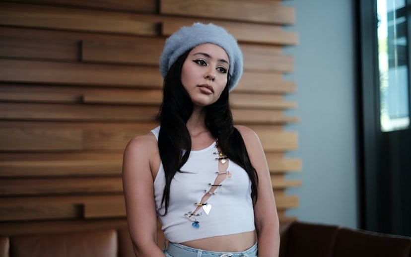 Episode 2 featured Maddy’s best fashion-filled moments to date, and her DIY top has made it at No. 7. Her white ribbed crop tank was accessorized with custom pins and a necklace by Cholé Marrata. She styled her outfit with a vintage beret by Parkhurst of Canada and belted blue jeans from Blow The Belt.