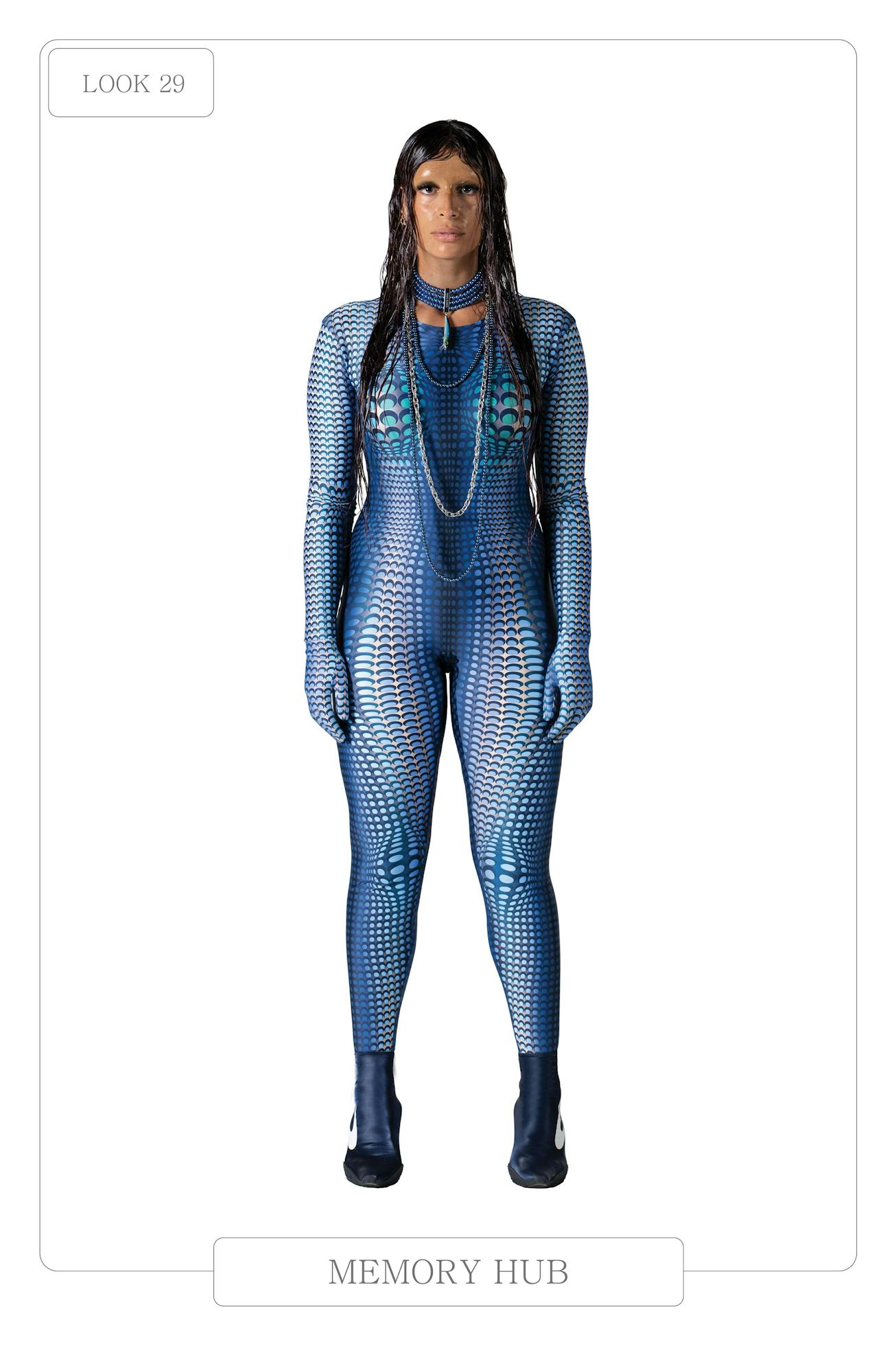 Known for her upcycling approach towards design, Serre used recycled jersey fabrics and regenerated denim in her "Amor Fati" collection. She also brought back her popular catsuit style with the new print, a trompe l'oeil design made from her signature moons.