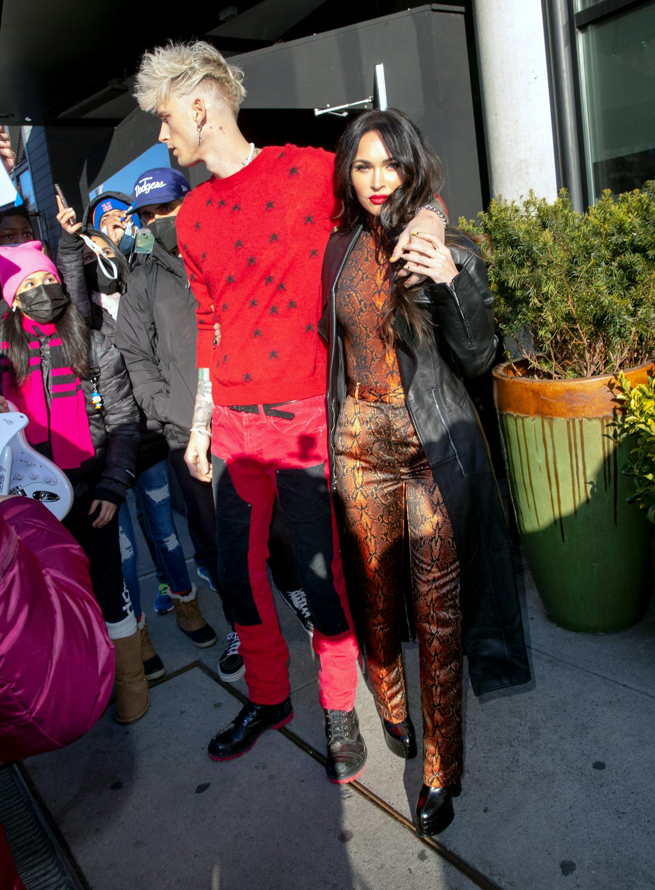 Megan Fox wore an orange LaQuan Smith snake print look outside of 30 Rock with Machine Gun Kelly.