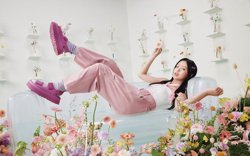 She’s now helping the brand debut its Spring/Summer 2024 collection, which includes the introduction of a few new shoes: the Stratus and GoldenGlow sandals, and the Venture Daze clog and slide — all styles that lean into the chunky, Y2K-inspired platform trend of the moment. The colorful campaign photos, shot by Ken Ngan in Seoul, South Korea, feature bunny clouds and bubbles, and have Hanni doing what any member of Gen Z would do in these shoes: hanging out on a couch, feet in the air, and scrolling through her phone.