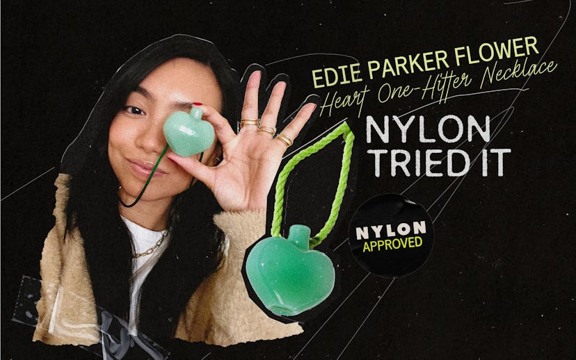 Since 2019, founder and designer Brett Heyman has seamlessly combined cannabis and fashion, offering stylish items — colorful lighters, floral-printed rolling papers, sculptural smoking pieces, graphic tees and toes, and more — for all of your weed-adjacent needs. Edie Parker Flower’s latest launch is its best example yet: a glass-blown, heart-shaped one-hitter necklace, complete with a cord string for an on-trend, vintage look. “We were playing around with these old Lalique necklaces in the office,” Heyman tells NYLON. “That sort of ‘90s nostalgia moment had us feeling very inspired.”