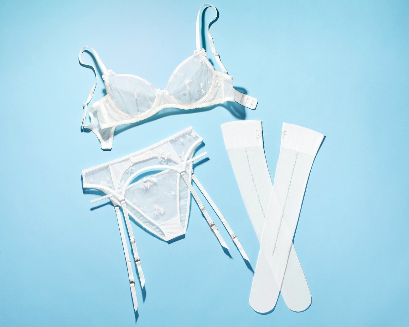 The fully embroidered lace collection comes in a wedding white hue with a corset, garter, string bikini, and unlined bra. There’s also a floral lace offering, which includes a blconette bra, high-leg garter, racerback bralette, thong, unlined bra, cincher, and thigh-highs in a light purple hue. Whether you want to wear some of the collection during your ceremony or save some of the sexier pieces for a post-reception celebration, the options are available.