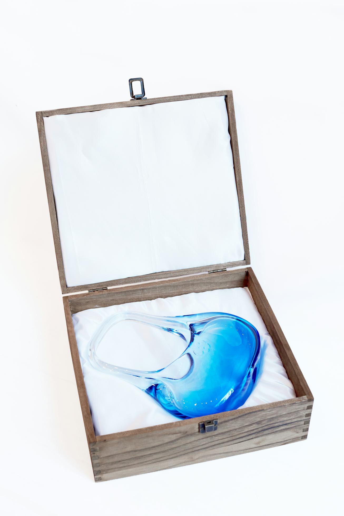 Hill has always been interested in pushing the barrier between the fashion and art worlds, previously hosting a collaborative exhibition with the brand Head of State, but for Raiffe the collaboration also serves as an opportunity to start a conversation between glass art and the rest of the art world. “There’s an interesting parallel between the relationship between fashion and art and glass and art,” he says. “I feel like a lot of established art institutions view glassblowing as a mindless practice of making decorative items, and I feel like that’s definitely not fair.” Each Glacier Bag takes a couple of hours of glass blowing before it cools overnight. Raiffe then has to grind the bottom flat, with the entire made-to-order process taking no longer than three weeks after ordering online.