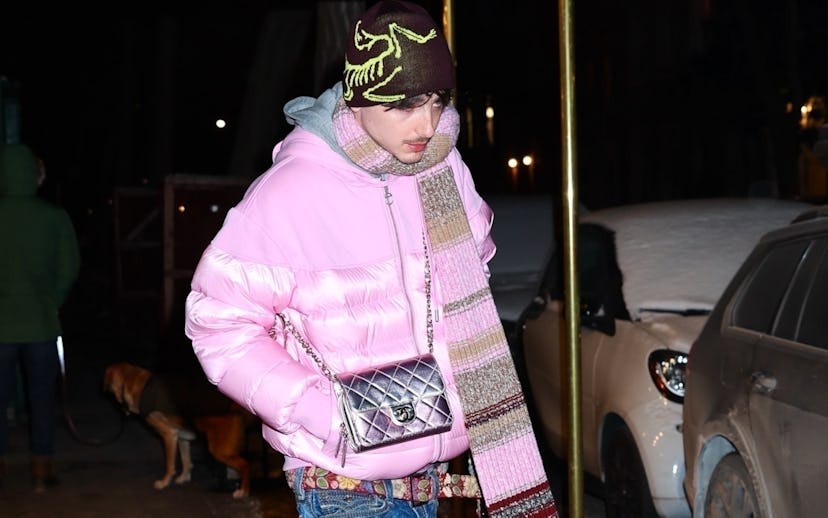 Chalamet has never dressed so boldly. For one, he showed up to the New York premiere of A Complete Unknown as a 2003 Dylan, blond wig and all. Beyond that, he’s been mixing True Religion (we confirmed with the brand he’s not getting paid, he just really loves it) with Arc’teryx beanies; Chanel crossbody bags; Alexander McQueen’s skull scarf, perhaps the ultimate accessory of the 2000s; and all manner of outerwear. In Paris, it was a Raiders jacket; in New York, a bubblegum-pink Telfar puffer.