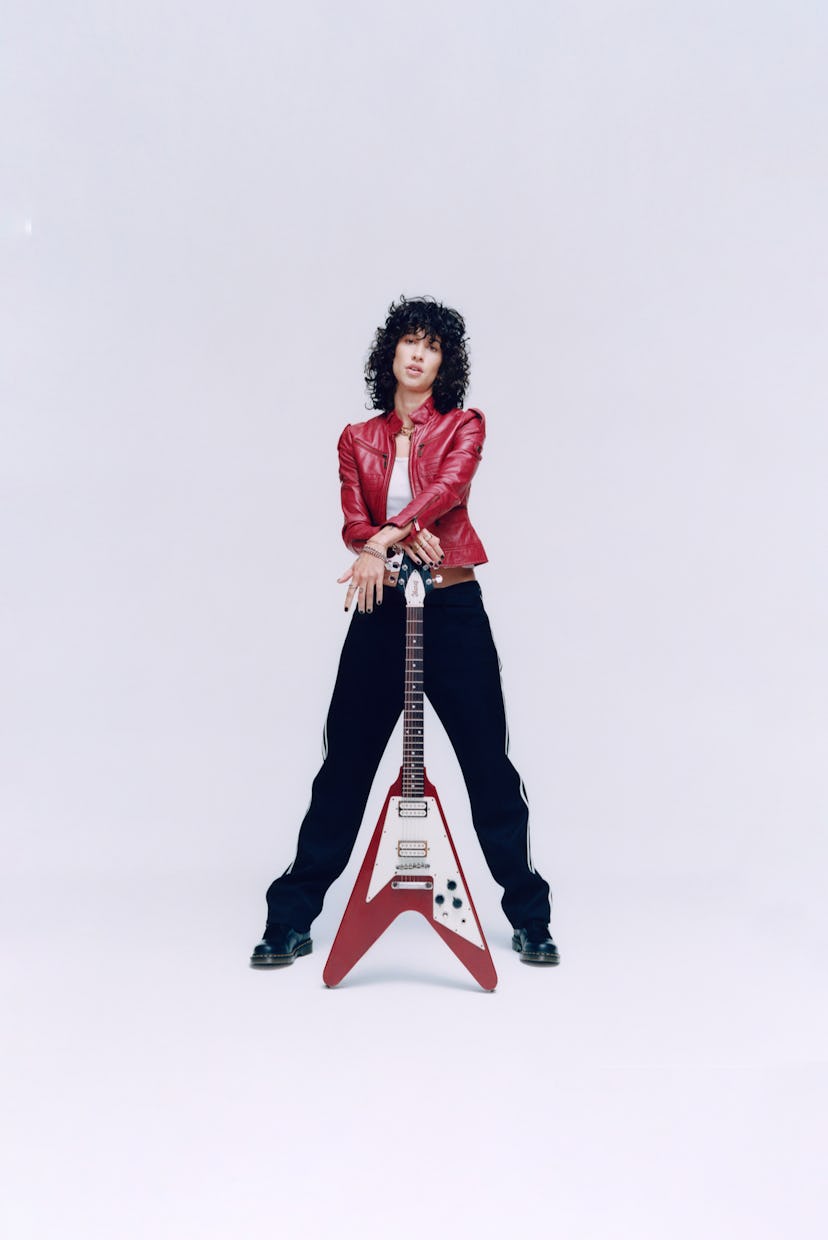 On tour, she pairs her ’70s-inspired shag with sleeveless tees, low-rise trousers, leather jackets, and a pair of beat-up 1460 boots. “I can’t tell the difference between a Dr. Marten shoe and my own foot,” she jokes. A sense of humor is undoubtedly her signature. When asked about touring essentials, she only picks one: “a lifesize cardboard cutout of myself.”