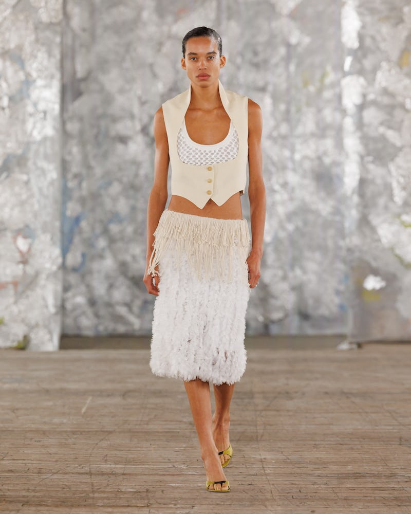 Recent runway examples, including a particularly sinuous and refreshing take at Diotima, give new ways to style it — and updates on the design that feel fresh. Isabel Marant’s Heathers-lite tribute makes sense in the current ‘80s resurgence, and make the case for layering it. The general feeling is one of looseness, even as the literal constriction the vests offer makes a comeback. At the end of the day, though, don’t girls just want to feel fun and sexy à la Sabrina Carpenter in her white waistcoat cut just below her chest to let her bra have its starring moment?