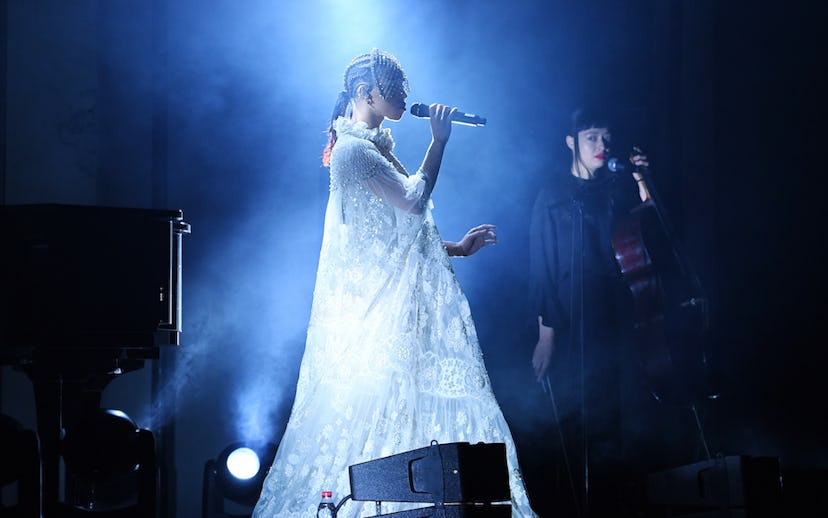 Dressed in a flowing lace cape-dress that shimmered with glittering floral appliqués and complimented the netted crystal mask that covered the top half of her face (all designed by Piccioli for Valentino, naturally), the artist born Tahliah Barnett stood atop a miniature stage, flanked by a cellist and a pianist, to deliver mesmerizing renditions of her MAGDALENE highlights "mary magdalene" and "cellophane."